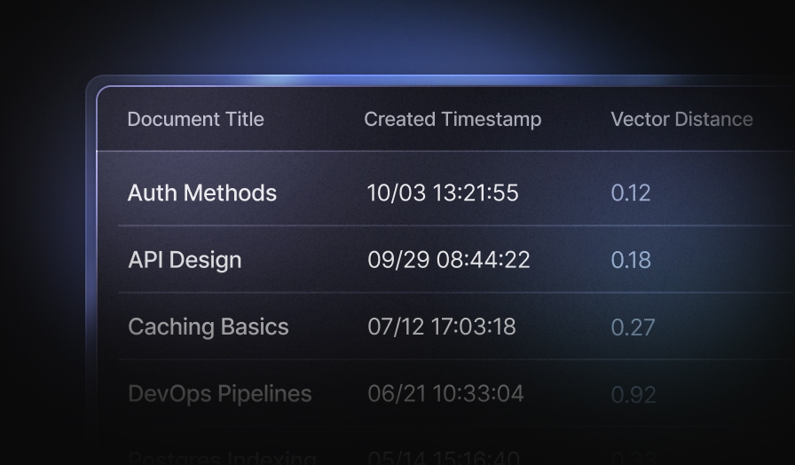 Combine vector search, full-text search, relational data, and SQL analytics in a single system. No glue code between databases.